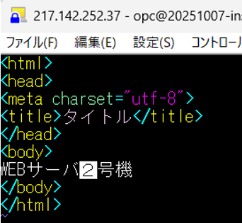 index.html ファイルを編集し、「WEBサーバ2号機」と表示されるようにします。