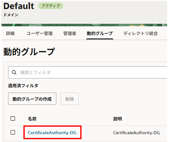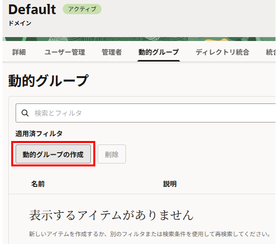 左上ハンバーガーメニューから アイデンティティとセキュリティ > ドメイン > Default > 動的グループタブ を選択し、「動的グループの作成」をクリックします。
