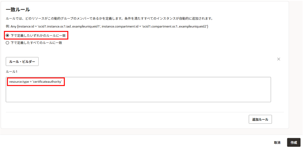 ※「リソースタイプが certificateauthority(認証局)であるリソースを、この動的グループのメンバーとみなす」という意味になります。
