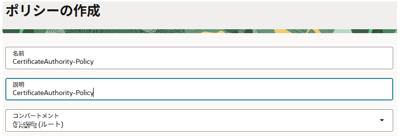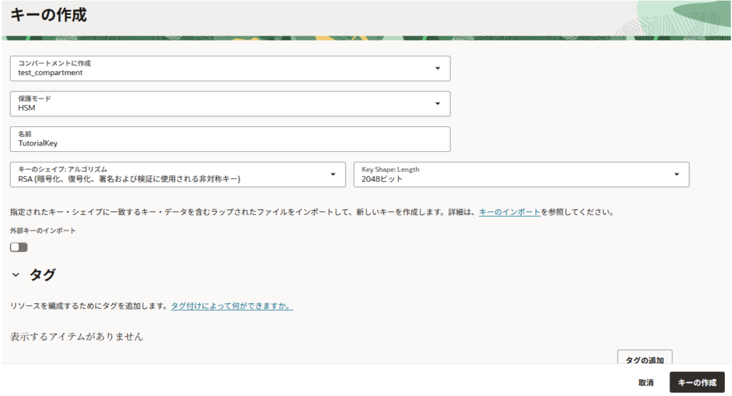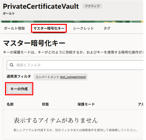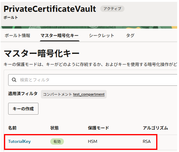 <コンパートメント名>のキー:作成したものを選択(デフォルトで選択されました)