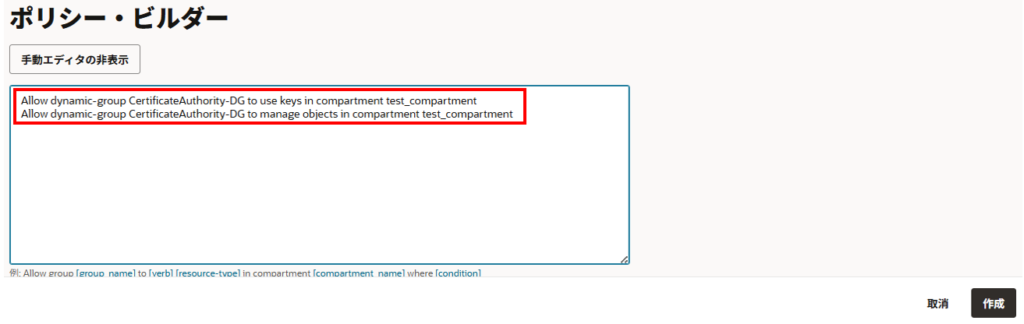 例:Allow dynamic-group 動的グループ名 to use keys in compartment コンパートメント名