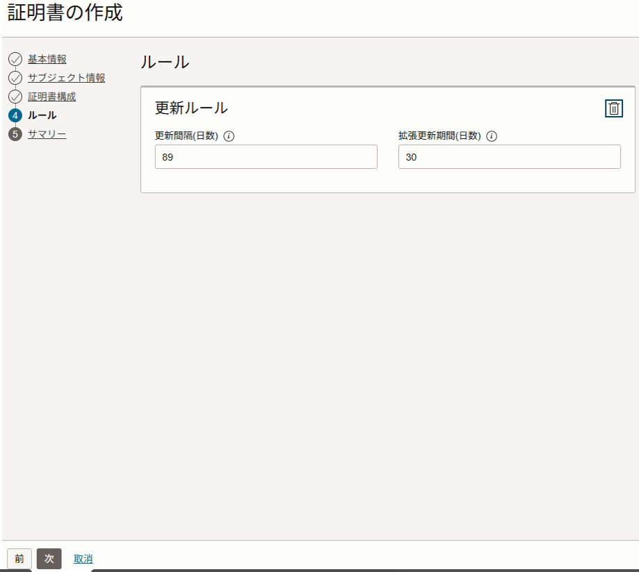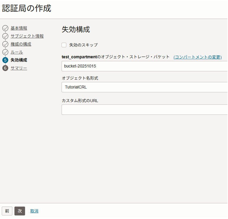 失効構成画面で以下を入力、選択し、左下の「次」をクリックします。