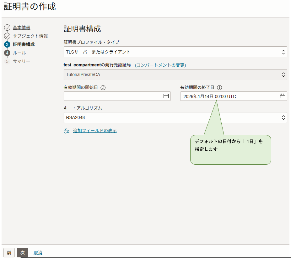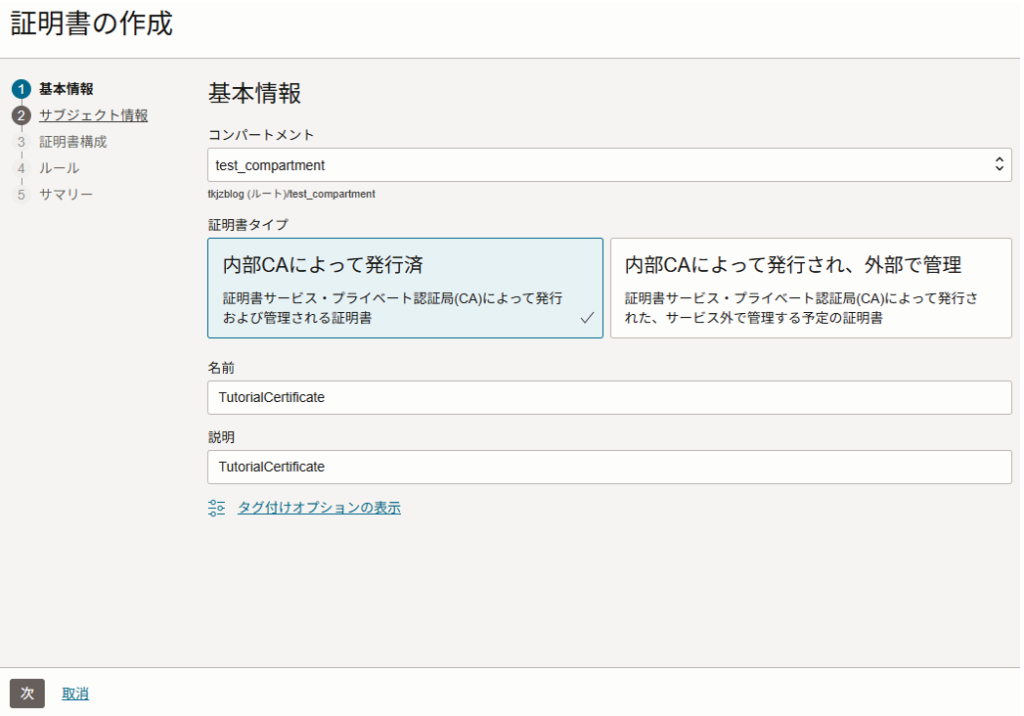 証明書構成画面で以下を入力、選択し、左下の「次」をクリックします。