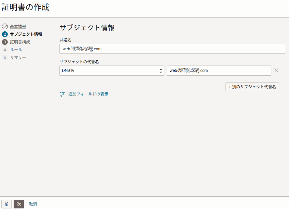 サブジェクトの代替名:リストボックスから [DNS名] を選択し、テキストボックスに任意のFQDNまたはドメイン名を指定します。