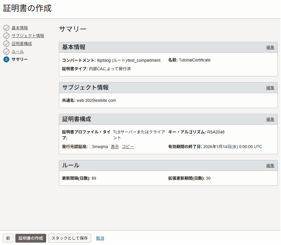 サマリーの内容を確認し、「証明書の作成」をクリックします。