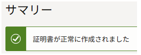 「証明書が正常に作成されました」が表示されることを確認します。
