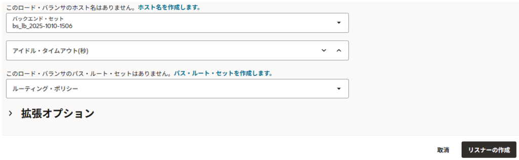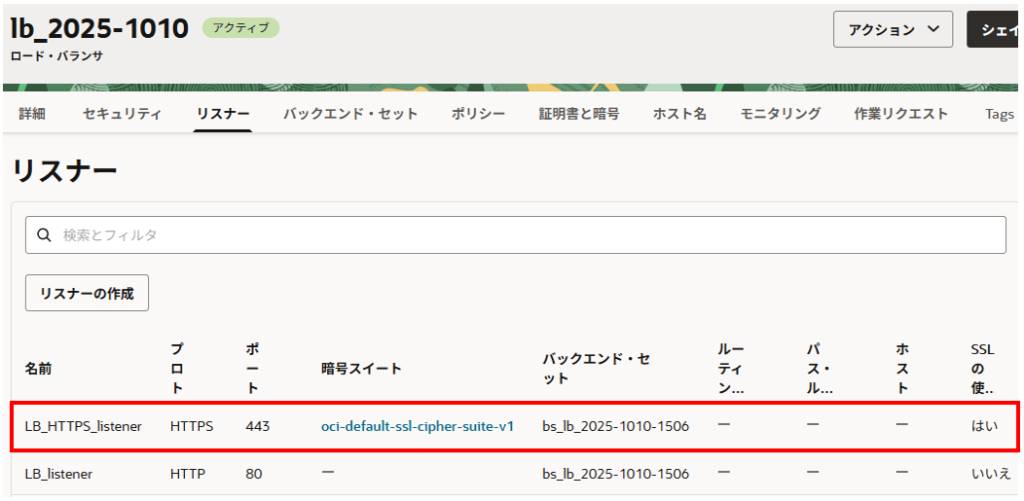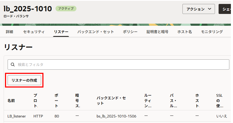 バックエンド・セットを選択し、右下の「リスナーの作成」をクリックします。