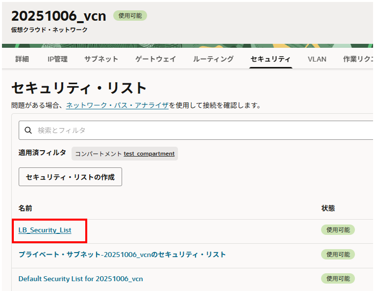 左上ハンバーガーメニューから ネットワーキング > 仮想クラウド・ネットワーク > 作成したVCN を選択、「セキュリティ」タブを選択、ロード・バランサ用のセキュリティ・リストをクリックします。