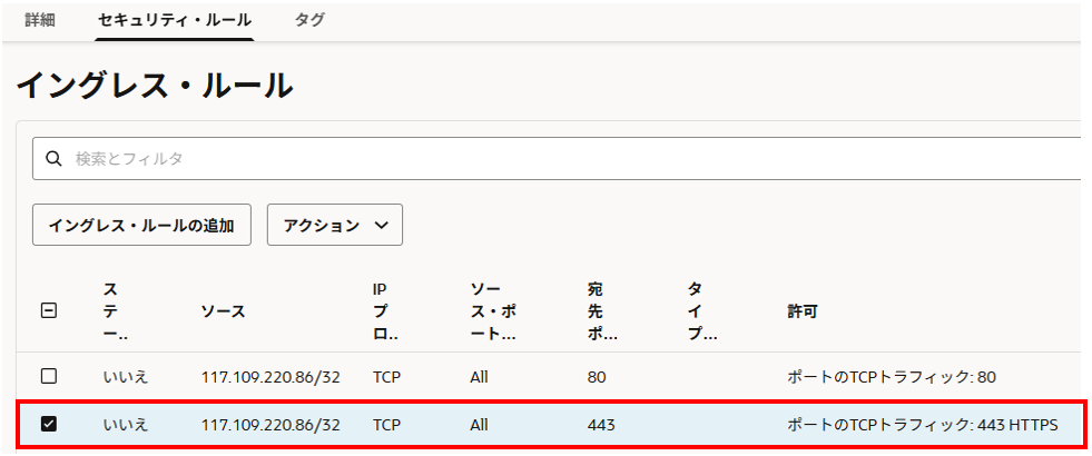 「セキュリティ・ルール」タブを選択、「イングレス・ルールの追加」から443番ポート宛てのTCPを許可するイングレスルールを設定します。