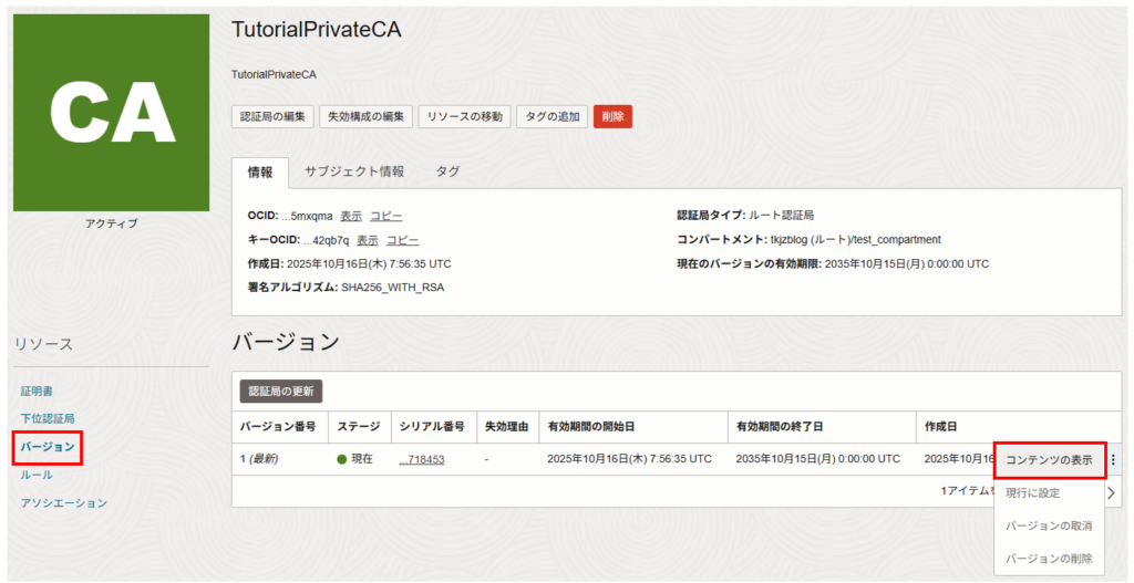 チュートリアルによると認証局は作成後すぐに削除はできず、最短で 7日後から削除指定が可能のようですので間違わないよう注意してください。