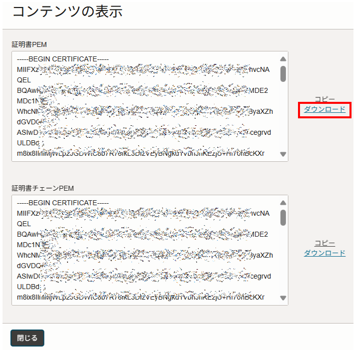 「証明書PEM」の「ダウンロード」をクリックして証明書ファイル(pem)をダウンロードします。