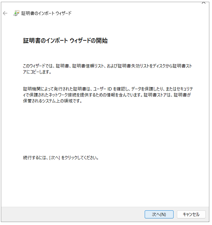 「証明書のインポートウィザード」が起動するので「次へ」をクリックします。