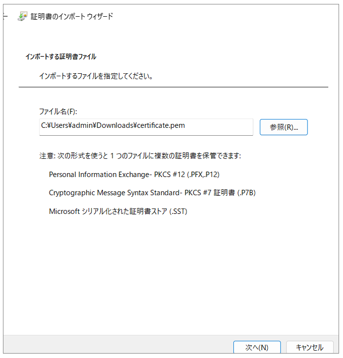 「参照」ボタンをクリックして事前にダウンロードしていた証明書ファイルを選択し、「次へ」をクリックします。