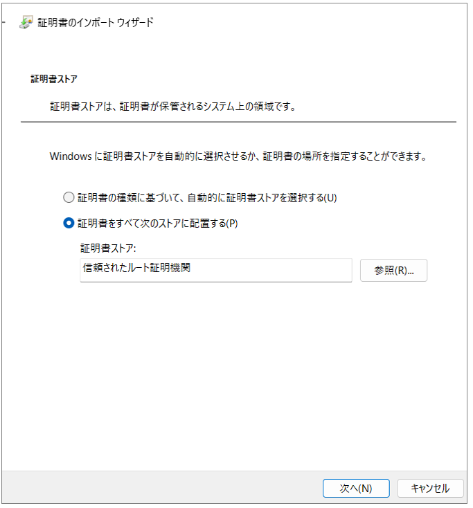 証明書ストアで「証明書をすべてのストアに配置する」を選択、「信頼されたルート証明機関」を選択し、「次へ」をクリックします。