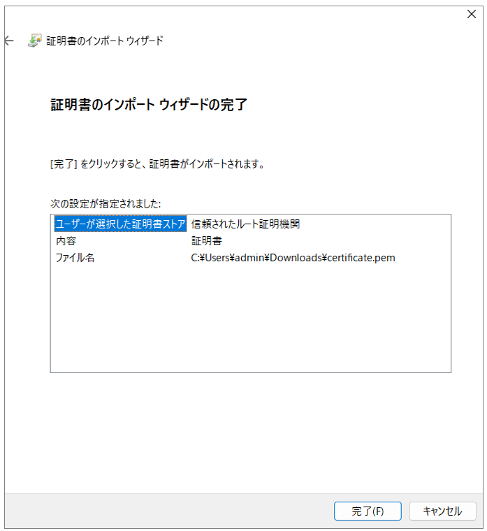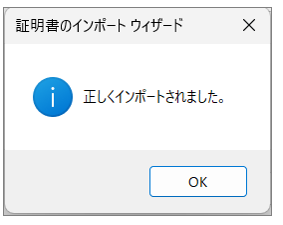 証明書のインポートウィザードの完了で「完了」をクリックします。