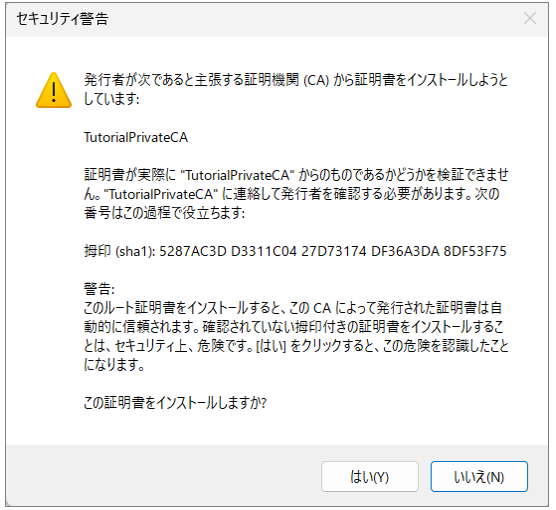 プライベート認証局で発行した証明書は、インターネット上の一般ブラウザからは信頼されません。