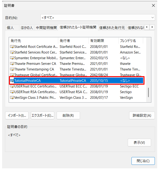 「信頼された証明機関」へルート証明書がインポートされました。