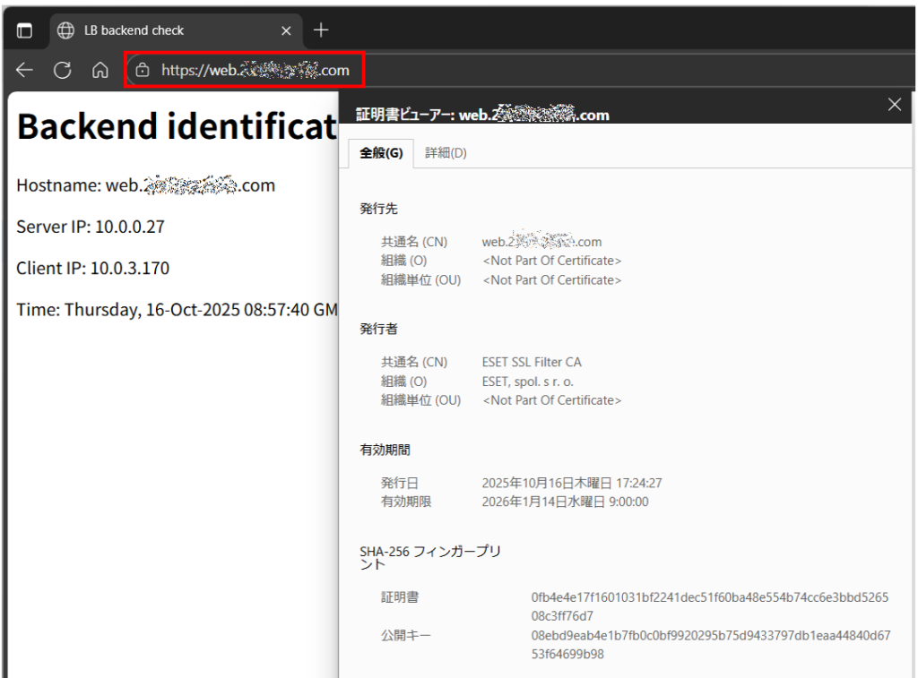 プライベート認証局を作成、証明書を発行し、ロード・バランサへ適用してHTTPS通信を検証することができました。