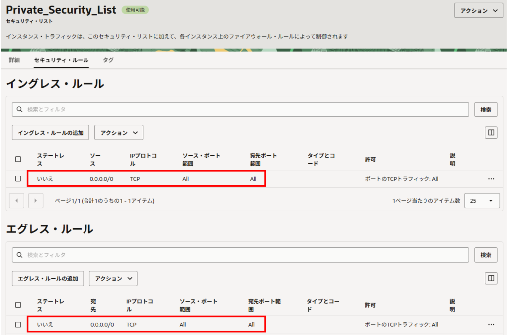 プライベート・サブネット用セキュリティ・リスト(Private_Security_List)を作成します。検証なのでイングレス・ルール、エグレス・ルールともにすべて許可で設定しています。