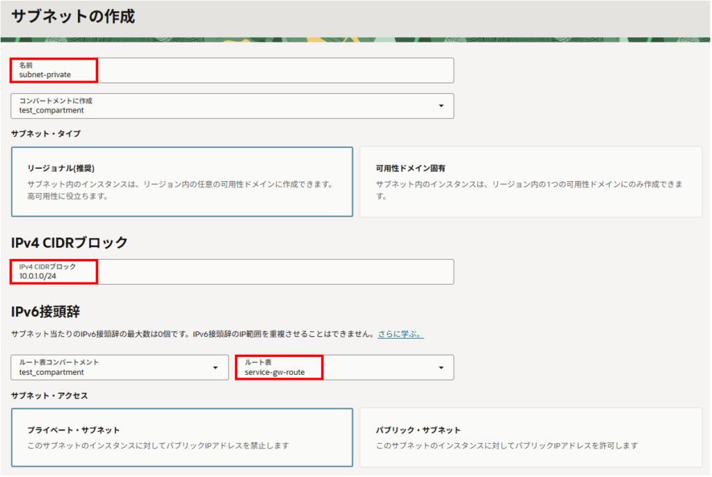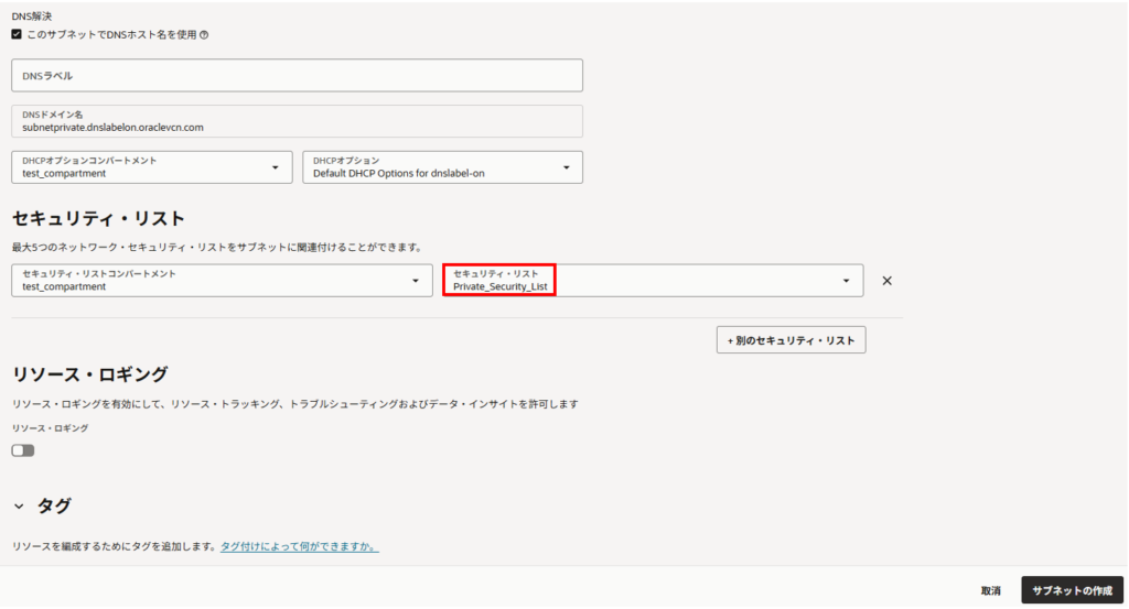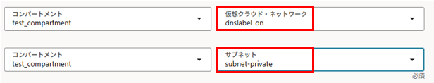 仮想クラウド・ネットワーク(VCN)とサブネット(プライベート・サブネット)を選択します。