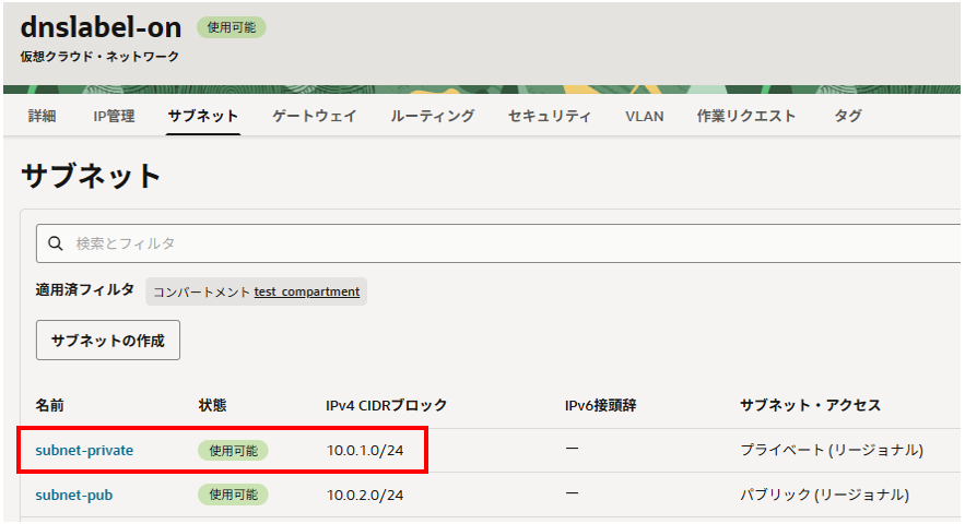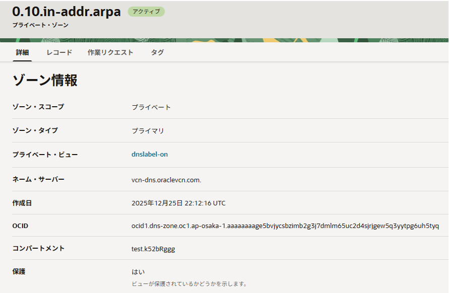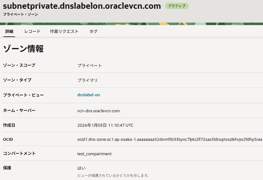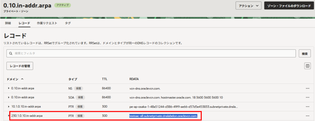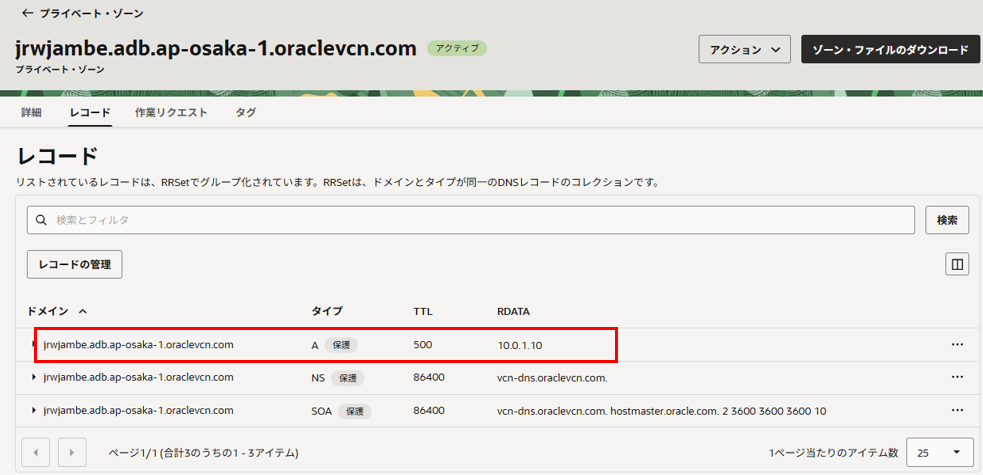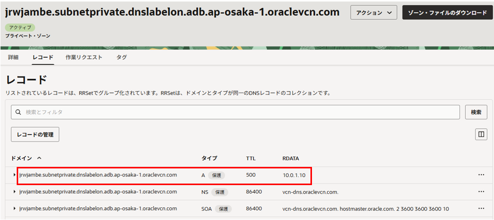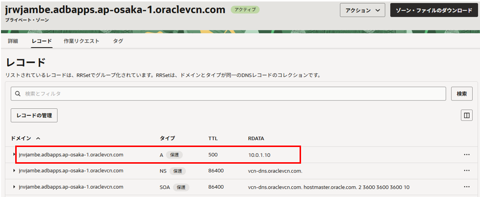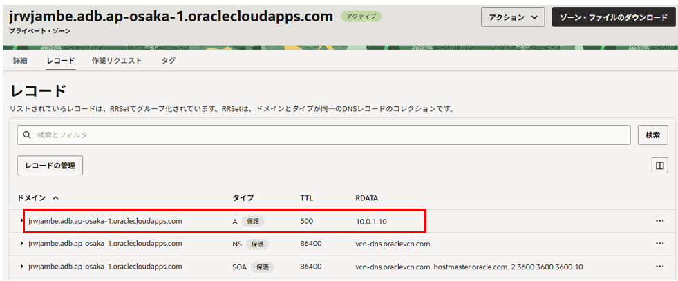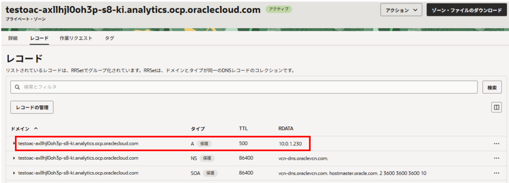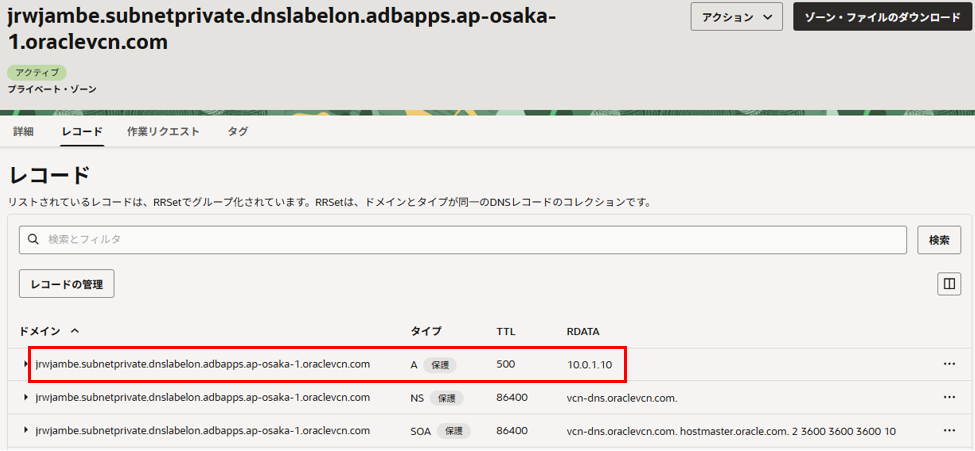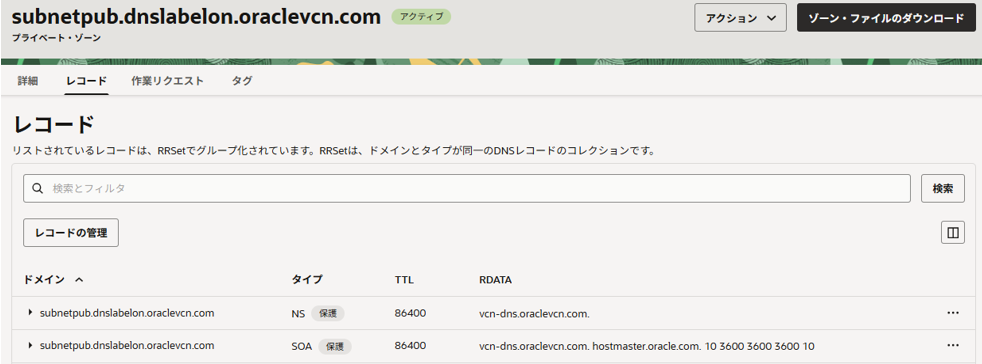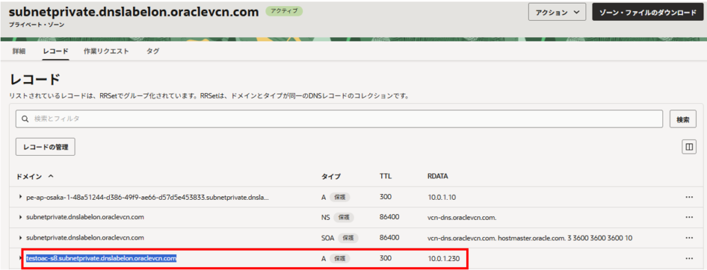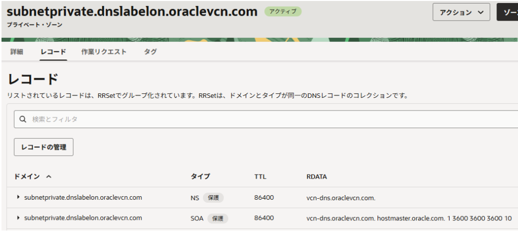 新規に追加されたゾーンにレコードが作成されて、VCN、プライベート・サブネットにも1つレコードが追加されました。