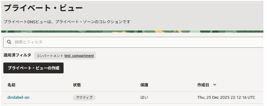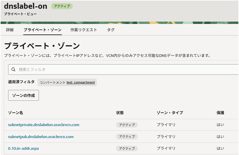 VCN、サブネット、セキュリティ・リスト、サービスゲートウェイを作成した時点でプライベート・ゾーンのゾーンとレコードを確認してみます。