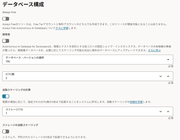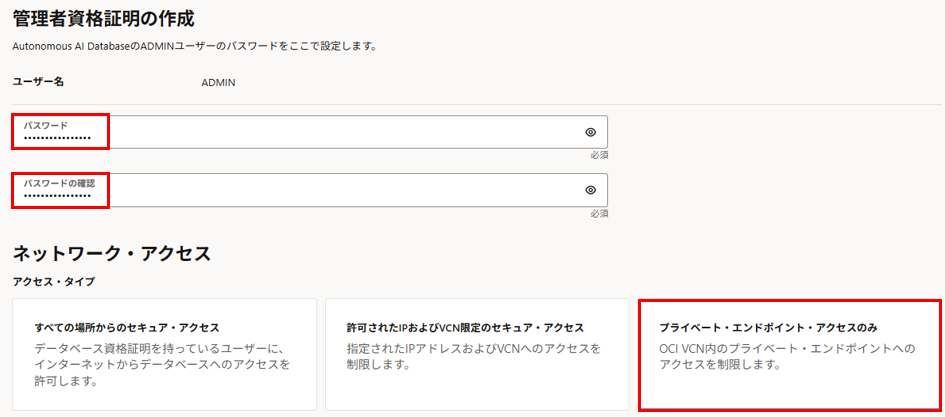 Always Free をONにするとネットワーク・アクセス・タイプで「プライベート・エンドポイント・アクセスのみ」が選択できなくなります。