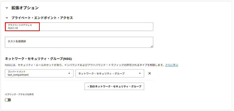 拡張オプションを展開し、プライベート・エンドポイント・アクセスのIPアドレスを設定します。