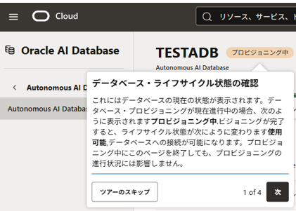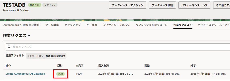 ADB作成のステータスが「プロビジョニング中」となりました。