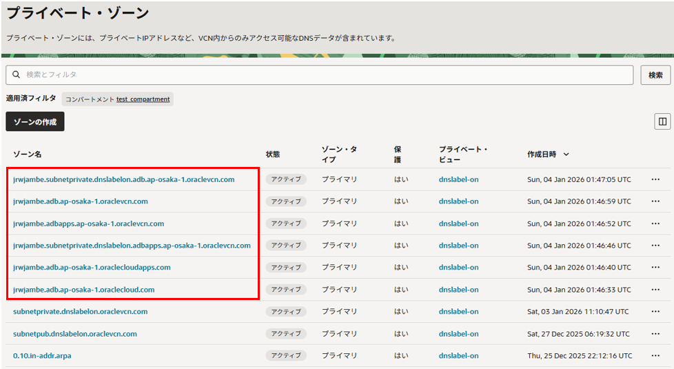 新規に作成された6つのゾーンとVCN、プライベート・サブネットに関するゾーン内にそれぞれレコードが作成されていました。