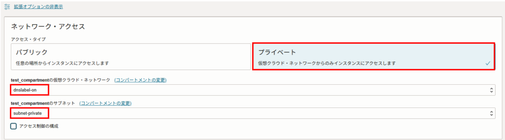 拡張オプションを展開し、OACにアクセスする方法(パブリックまたはプライベート)を選択します。プライベートにする場合は、OACに対して使用するVCNとプライベート・サブネットを選択します。