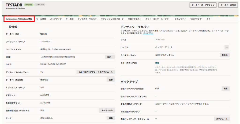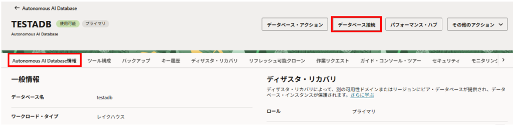 「Autonomous AI Database情報」タブを選択し、右上の「データベース接続」をクリックします。