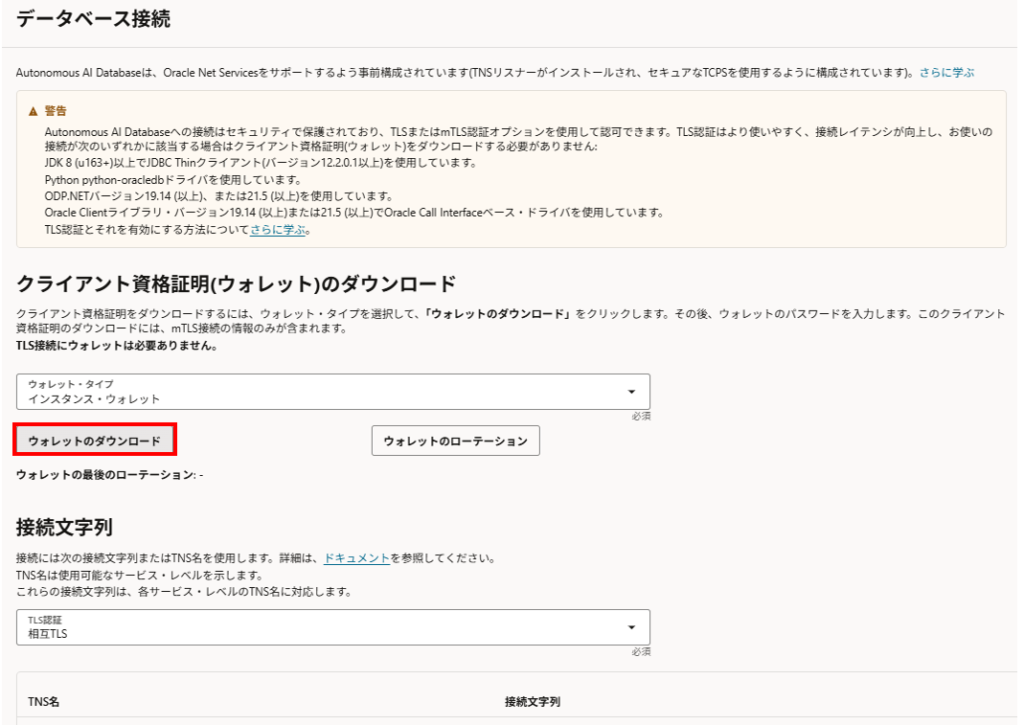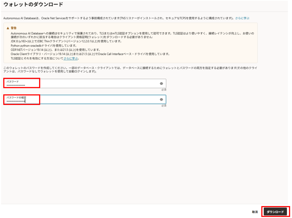 「ウォレットのダウンロード」をクリックし、zip形式のウォレットをダウンロードします。