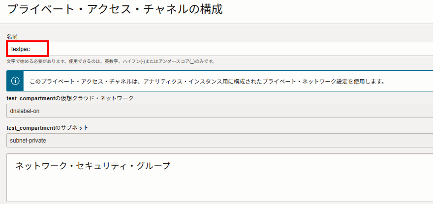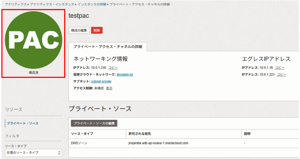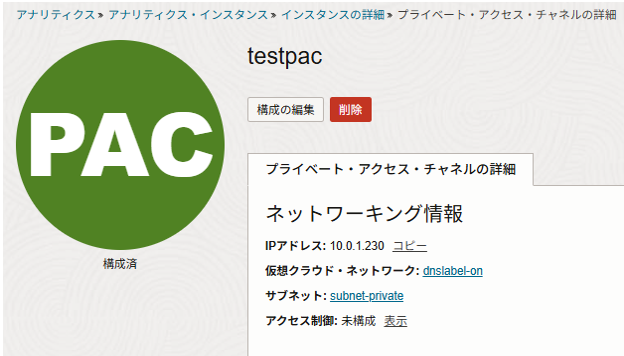 左ペインの「プライベート・アクセス・チャネル」をクリックし、プライベート・アクセス・チャネル名(testpac)をクリックします。