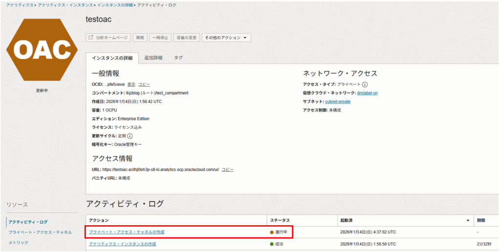 アクションに「プライベート・アクセス・チャネルの作成」が表示され、ステータスが「進行中」であることが確認できます。