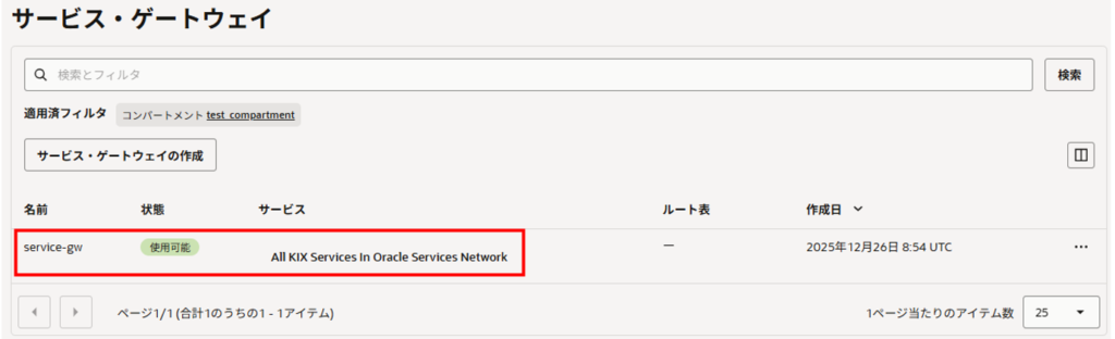 次のサービス・ゲートウェイ(service-gw)を「All KIX Services In Oracle Services Network」で作成しました。