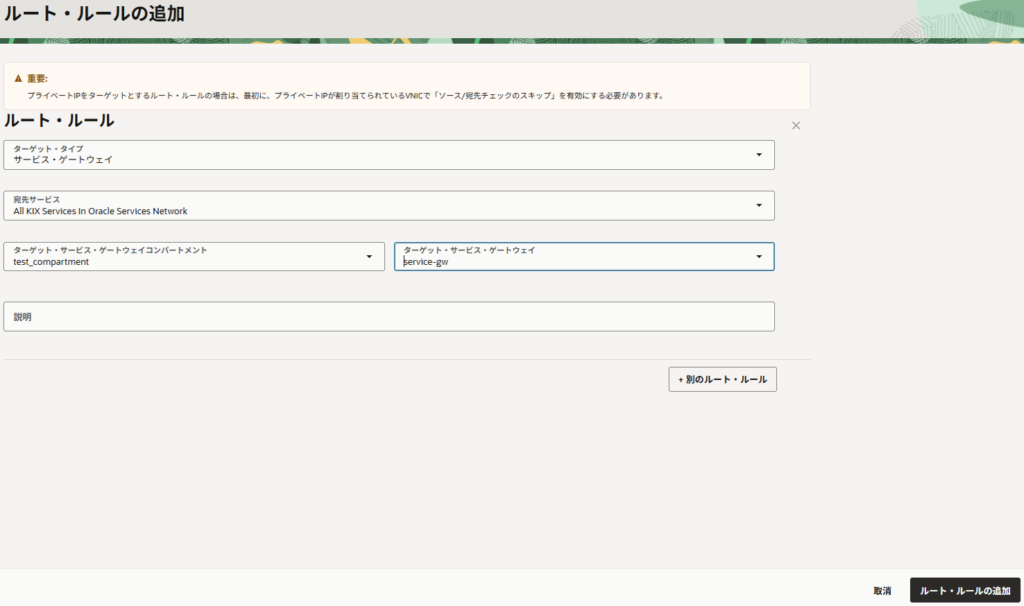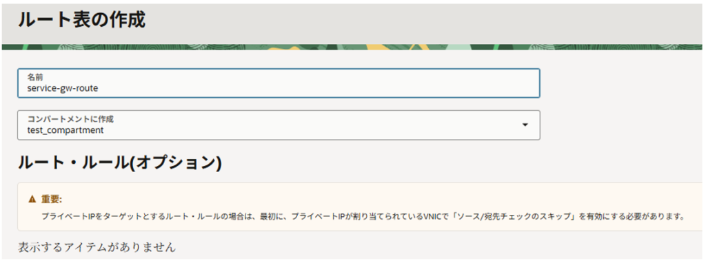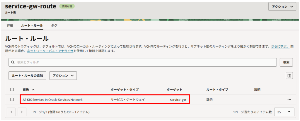 ルート表(service-gw-route)を作成して、ターゲット・サービス・ゲートウェイを「service-gw」に設定しました。